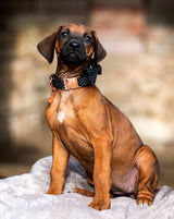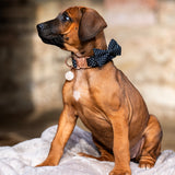 Every day black & white bow tie dog collar and leash with details in rose gold.