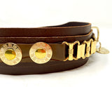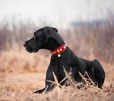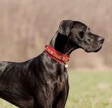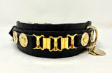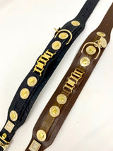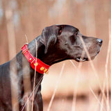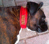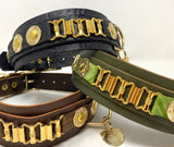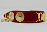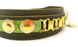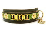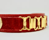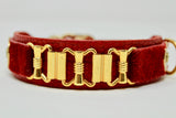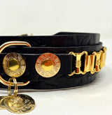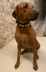 We highly recommend this sturdy dog collar in different colors with golden metal details. Small beautiful details in soft suede leather in the center matching the croco.