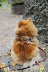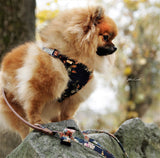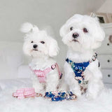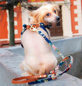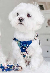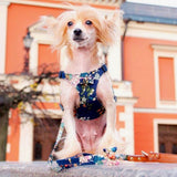 Beautiful adjustable harness for very small to medium small dogs in navy blue with flowers.