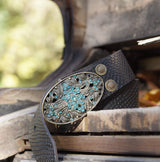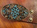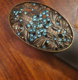 Cinturón de cuero resistente cristalizado con hebilla grande de Swarovski turquesa.