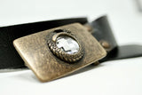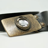 Nuestro cinturón Dragón es un cinturón genial tanto para hombre como para mujer. Nos encanta en cuero negro con el gran cristal blanco Blue Nile en el centro. También se puede elegir en metal plateado y con una pieza central de cristal negro comprimido.