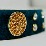 Se utilizan pieles suaves para mayor comodidad. En el centro, un gran cristal de ámbar decora este lujoso collar para mascotas.