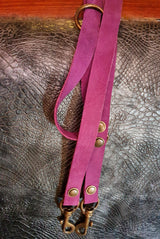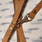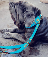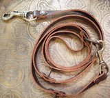 Esta es una correa multiusos también buena para el adiestramiento. Extra larga y se puede acortar o alargar. Viene en diferentes colores de cuero. Ganchos dobles.