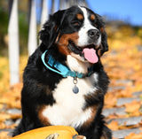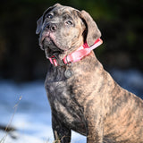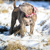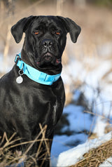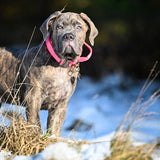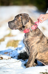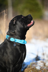 Sporty adjustabable dog collar perfect for every day active dogs. Handle to stop the dog on the outside and velcro for adjustment of size. Can adjust a lot with the straps.